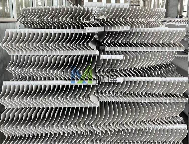 平板式除霧器適用于中、低氣速的吸收塔,主要用于氣體和流體的分離,一般被裝在吸收塔的頂部,可以很好去除3-5μm的霧滴,其分離出來的液滴直接落入吸收塔內的漿液池中。根據性能要求,平板式除霧器可以用于一層或者多層系統,并且可以加裝在線沖洗系統,另外平板式除霧器也可以配合濕電靜電除霧器、管束除塵除霧器等設備使用。